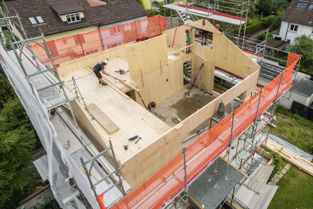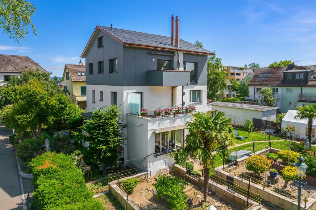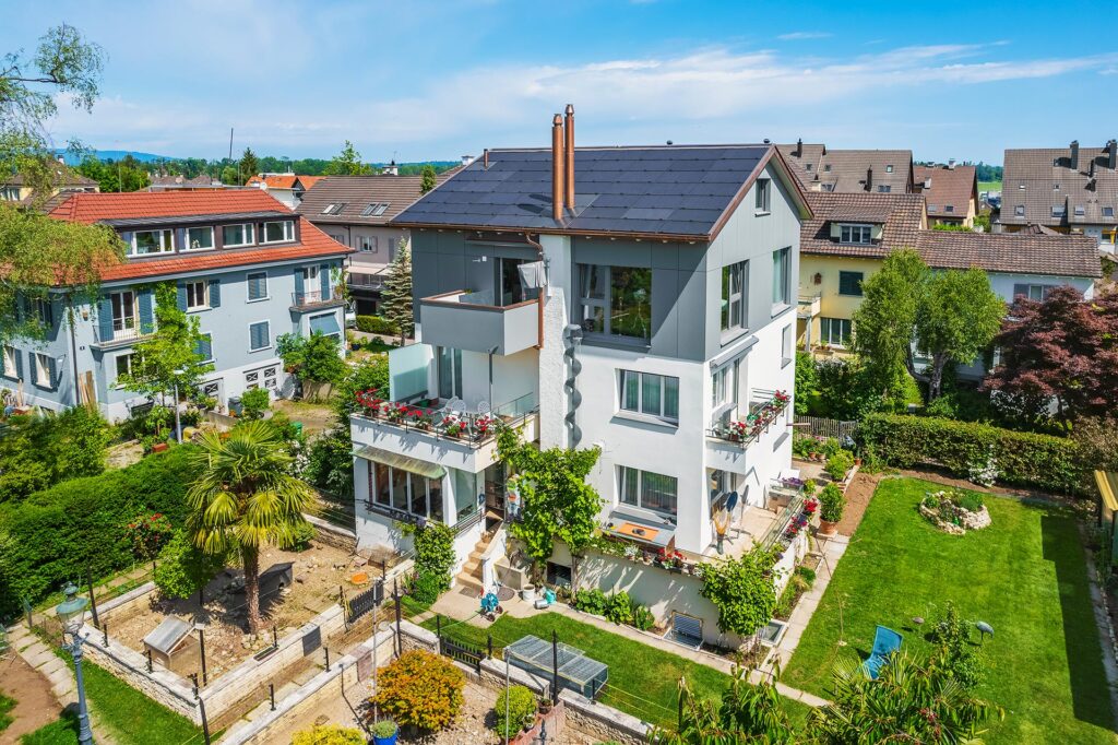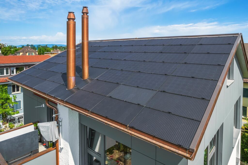 - Süden ausgerichtete Dachfläche mit Satinierten PV Modulen von 3SAnforderung der Baudirektion der Stadt Zürich zur Vermeidung von Spiegelungen