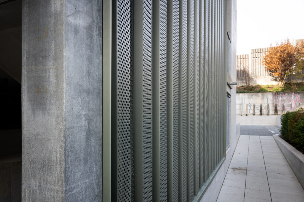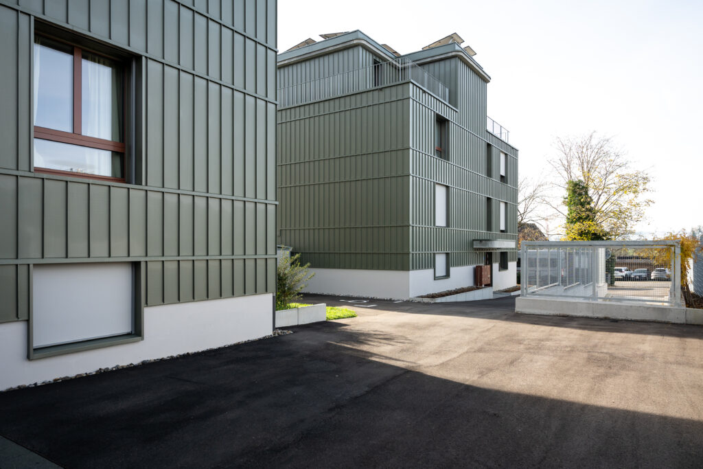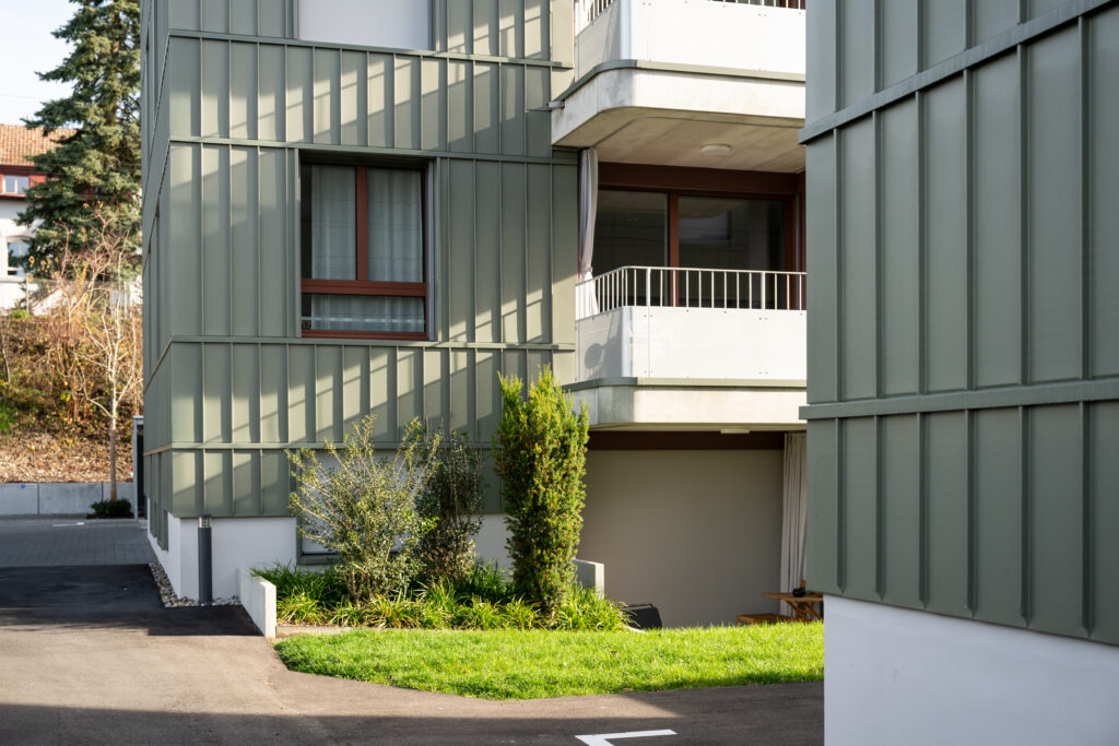 Die Scherrer Metec AG war für die Ausführung der Unterkonstruktion und Dämmung (System Vento von Swisspor) sowie für die Metallfassade in «VM ZINC Pigmento Grün» verantwortlich. Die wärmegedämmte, hinterlüftete Fassadenkonstruktion erfüllt hohe bauphysikalische Anforderungen in Bezug auf Wärme-, Feuchte- und Witterungsschutz.