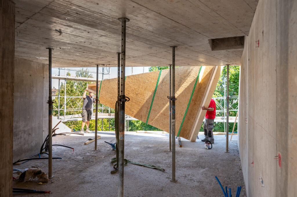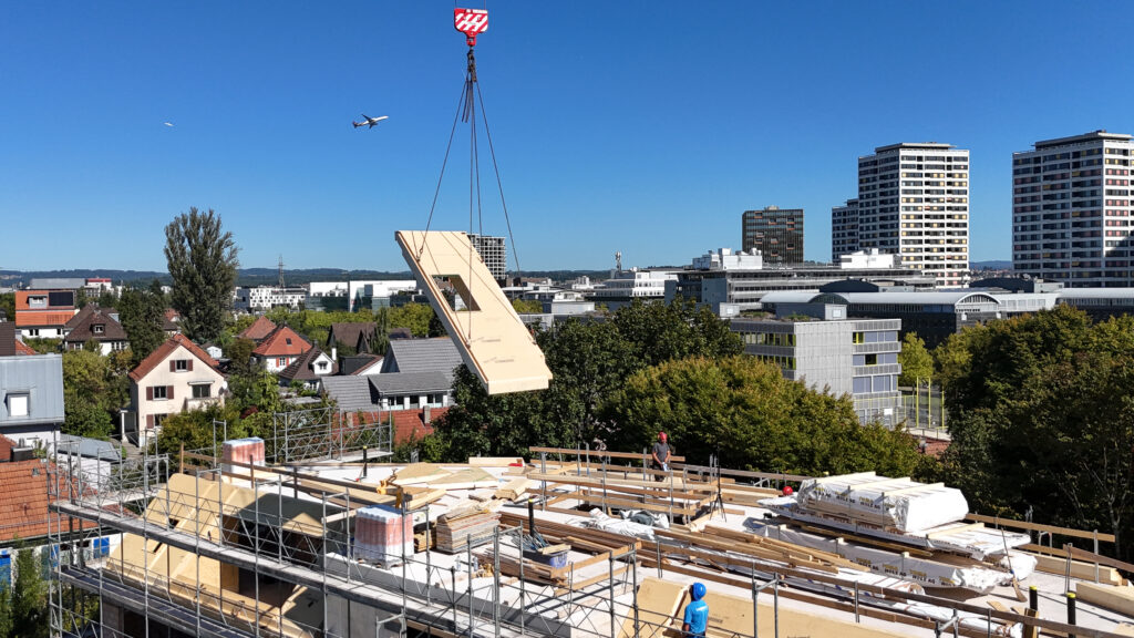 Die Dachfläche von rund 250 m² wird im First- und Traufbereich auf massiven Betonplatten abgestützt. Dank präziser Planung und effizienter Vorfertigung konnte die gesamte Dachstockmontage in nur vier Tagen abgeschlossen werden.