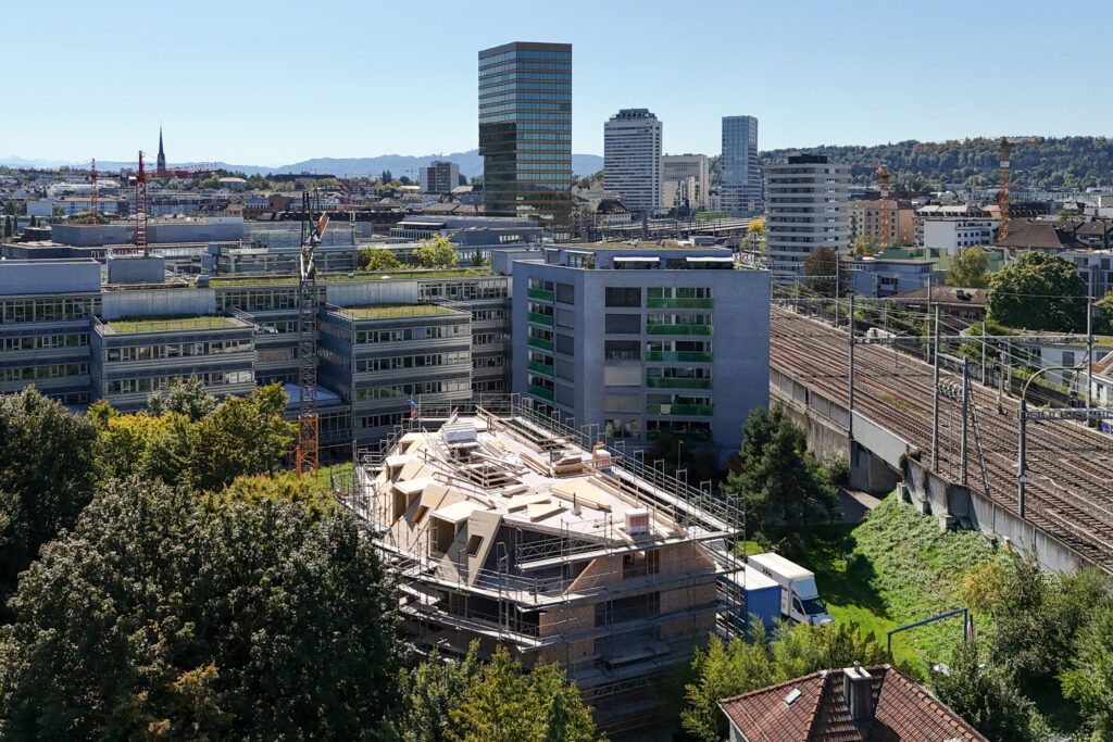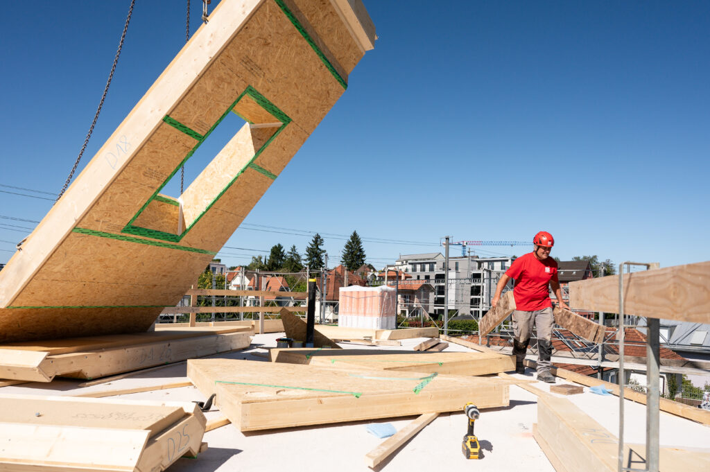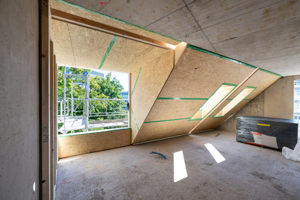 Zum Einsatz kommen vorgefertigte, gedämmte Holzelemente inklusive sämtlicher Gesimsabschlüsse. Zwei Dachterrassen auf der einen Seite sowie grosszügige Gauben auf der anderen Seite schaffen lichtdurchflutete Wohnräume mit besonderem Charakter.