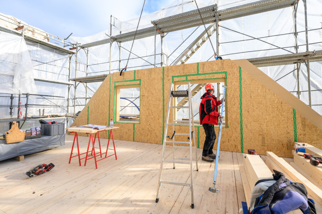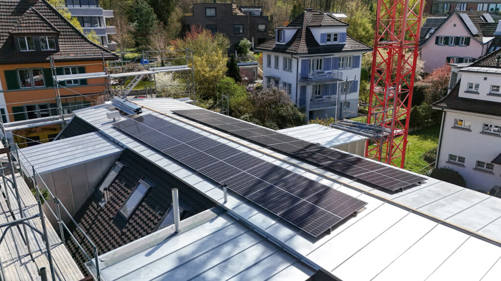 Dank hoher Vorfertigung konnte die Montage der tragenden Holzelemente, Wände und des Daches innerhalb einer Woche abgeschlossen werden – witterungsgeschützt und zeiteffizient. Der weitere Ausbau umfasste die Dacheindeckung mit Biberschwanzziegeln, die Verblechung des Zinnendachs sowie die Abdichtung der Loggien. Auch die Integration von Photovoltaikmodulen wurde durch unsere Fachabteilungen realisiert.