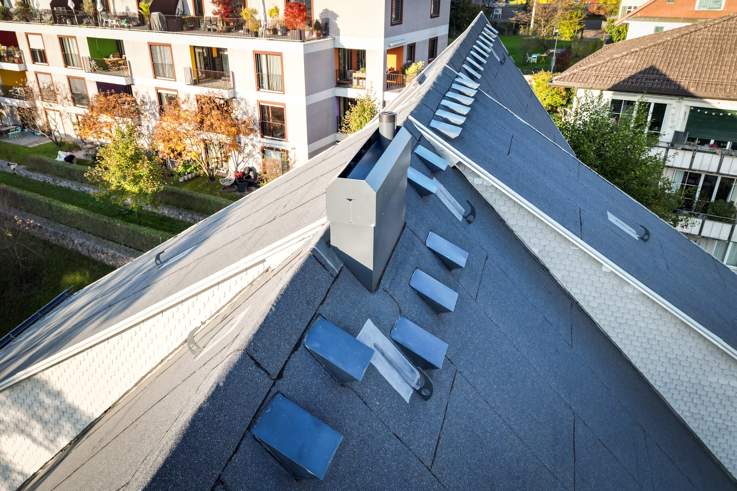 Dank hoher Vorfertigung konnte die Montage der tragenden Holzelemente, Wände und des Daches innerhalb einer Woche abgeschlossen werden – witterungsgeschützt und zeiteffizient. Der weitere Ausbau umfasste die Dacheindeckung mit Biberschwanzziegeln, die Verblechung des Zinnendachs sowie die Abdichtung der Loggien. Auch die Integration von Photovoltaikmodulen wurde durch unsere Fachabteilungen realisiert.